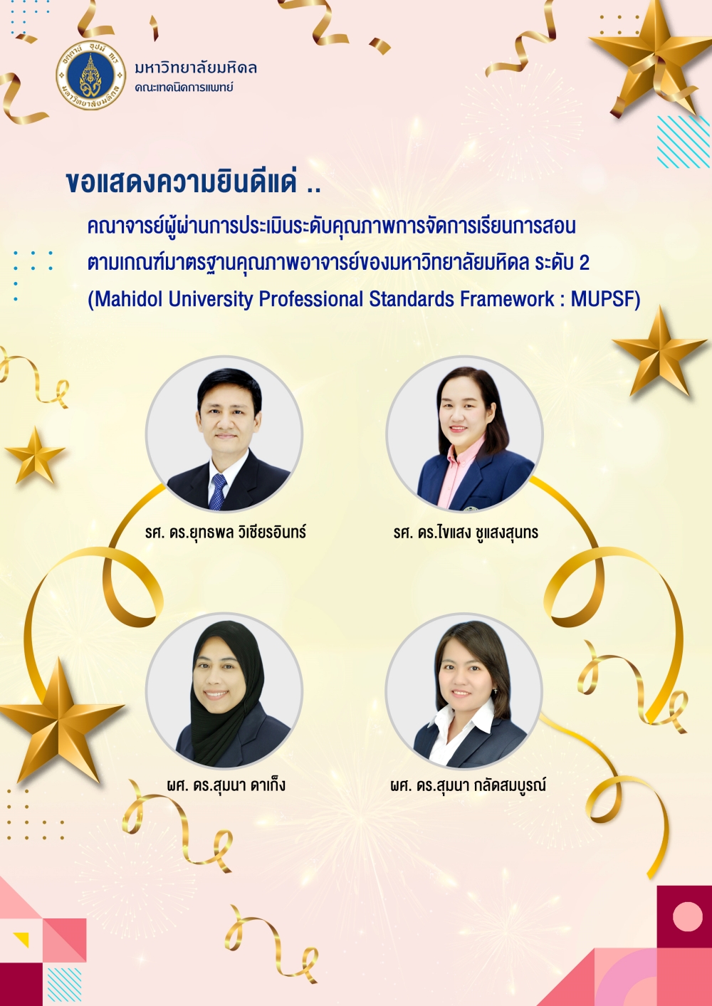 ผู้ผ่านการประเมินระดับคุณภาพการจัดการเรียนการสอนตามเกณฑ์มาตรฐานคุณภาพอาจารย์ของมหาวิทยาลัยมหิดล ระดับ 2